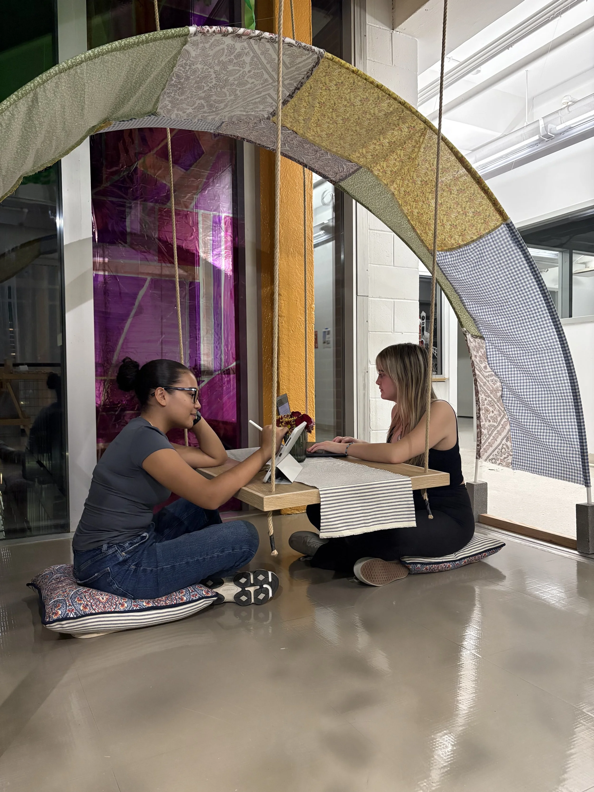 Above the table and seating area, the arch provides a feeling of comfort. This arch, designed with a series of boho-inspired patterns, is stitched together in a patchwork design. The patterns are not only visually engaging but are also held in place by PEX tubing that runs along the underside, providing structural integrity while maintaining a light and airy feel.