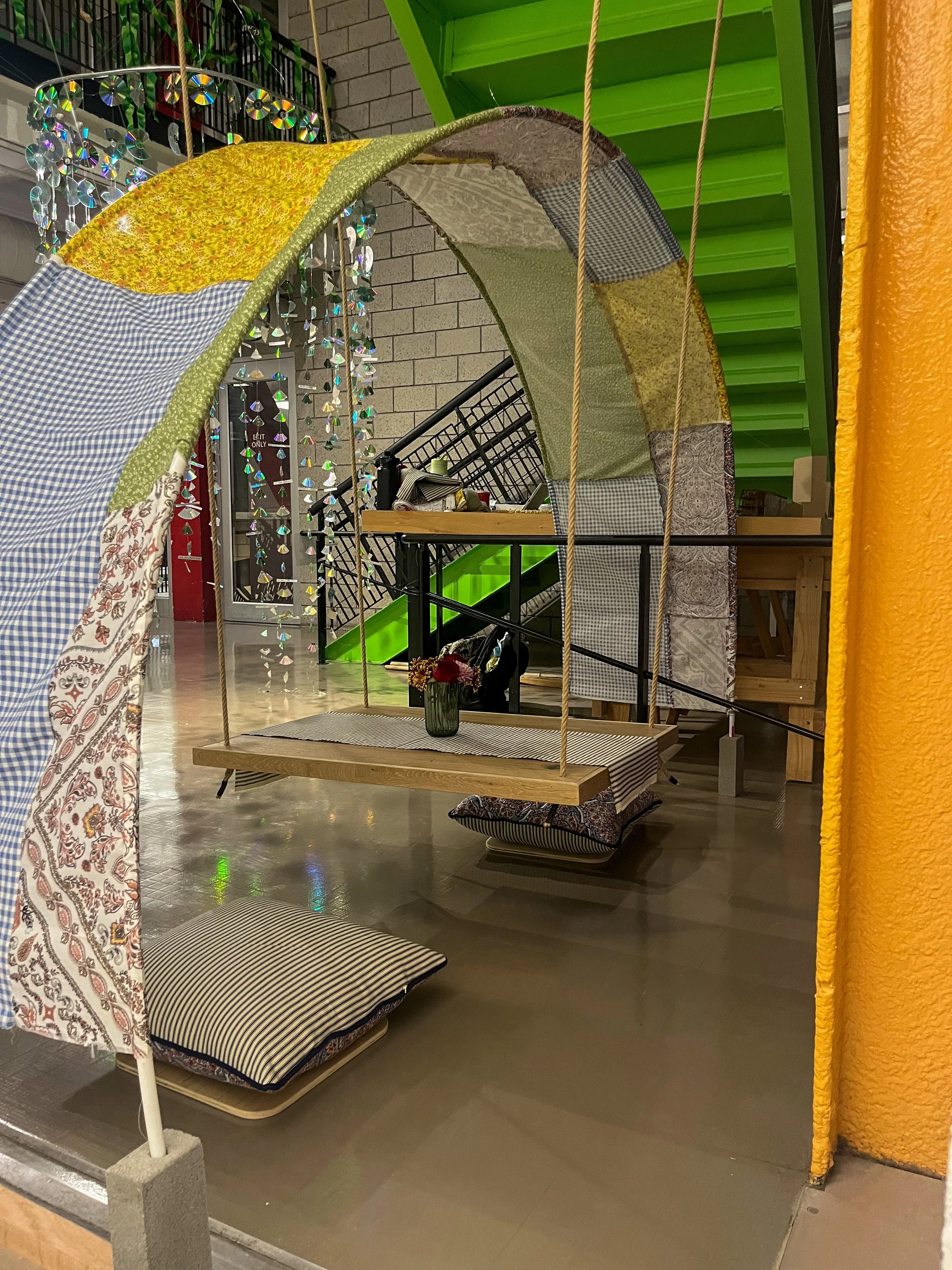 The centerpiece of The Nook is the "floating" table, which is suspended from the balusters of the staircase above. Its suspension is achieved through the use of manila rope, which is securely tied at each of the four corners using a traditional bowline knot. This not only ensures the table's stability but also lends a rustic feel that ties back to the overall bohemian feel of the space.